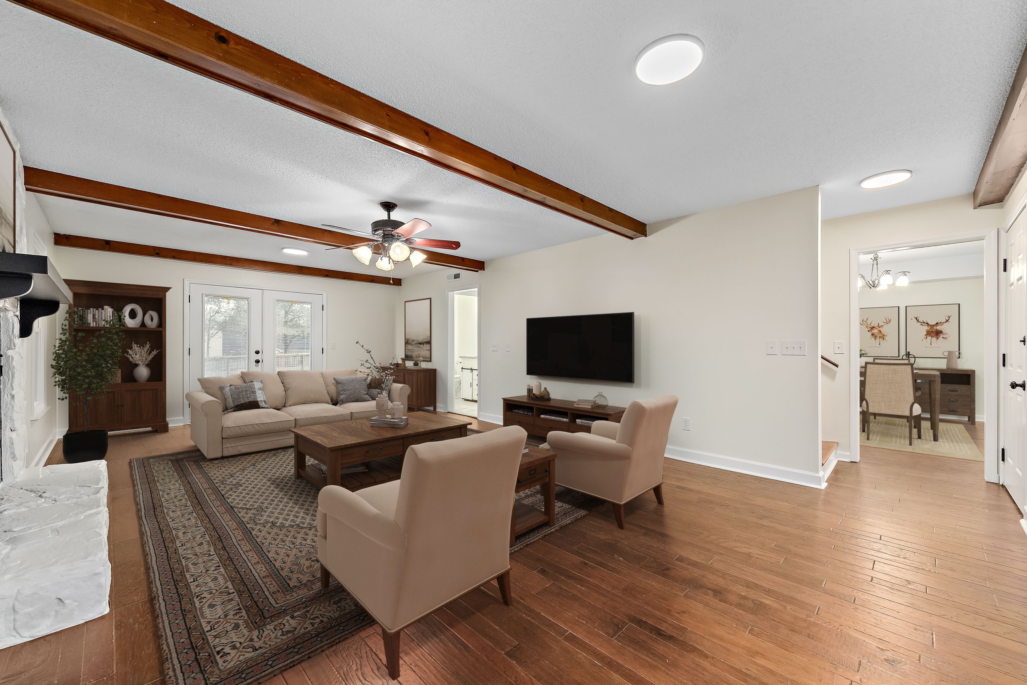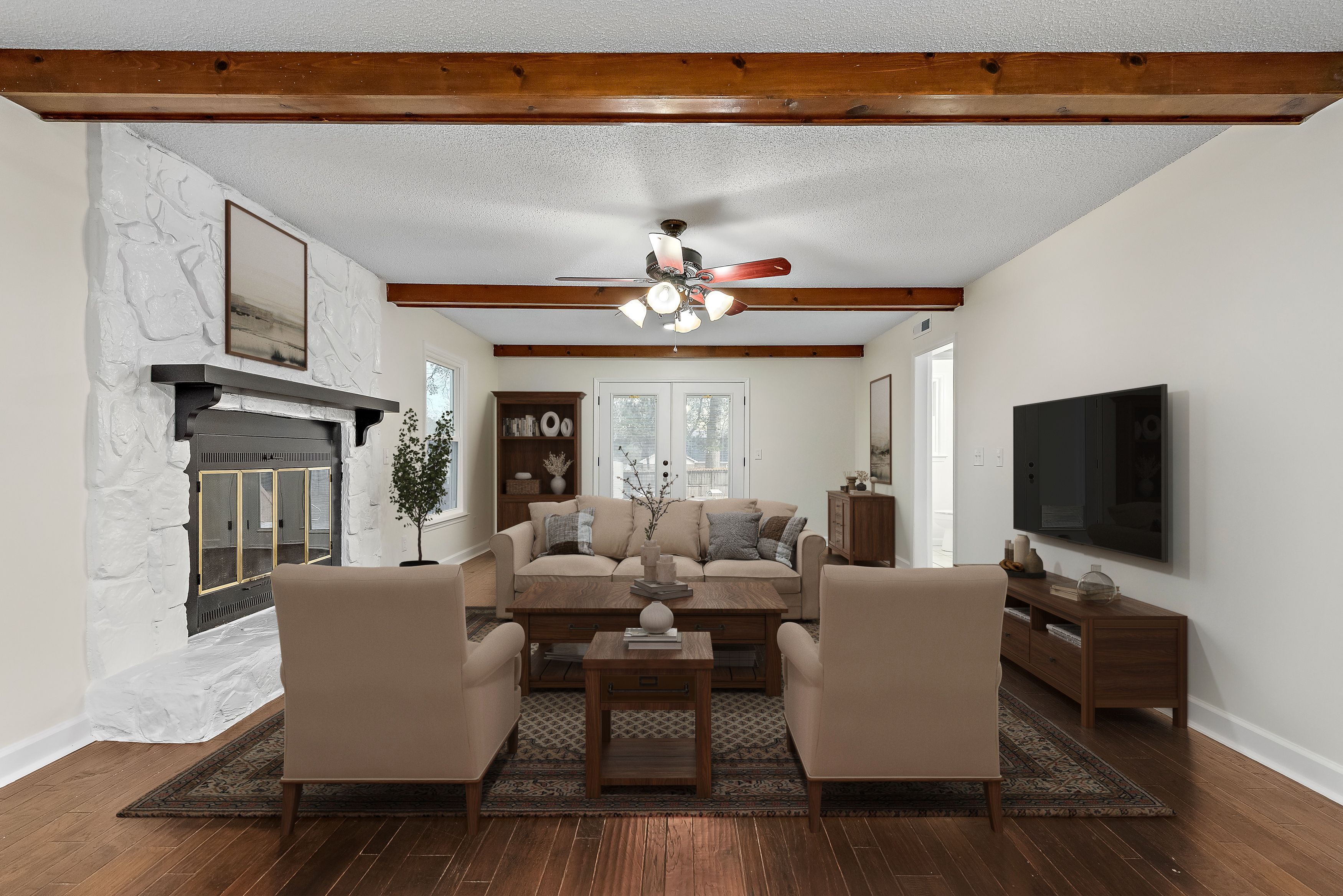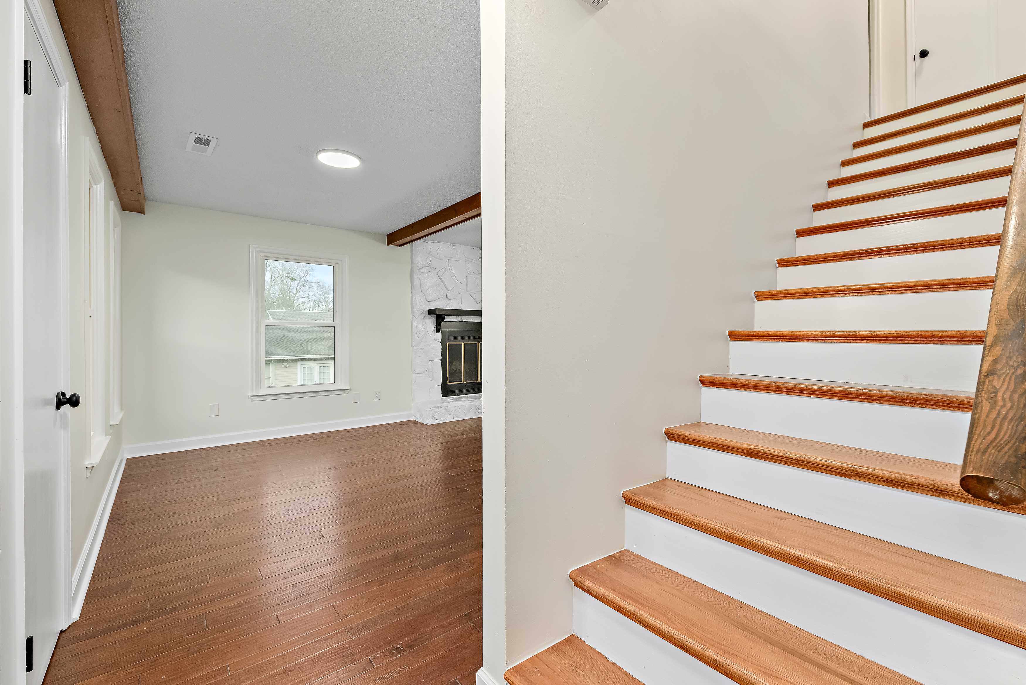 The cozy living room—complete with a painted stone fireplace and wood-beam accents—is perfect for winter nights, and outside, summer awaits with a newly finished back deck ready for gatherings.